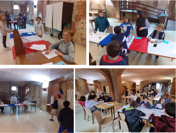 -élection à deux tours des délégués et de leurs adjoints pour tous les niveaux, du CP à la 3e, dans la salle Pierre Fourier transformée en bureau de vote avec urne et isoloirs prêtés par la mairie (respect de la parité si possible)